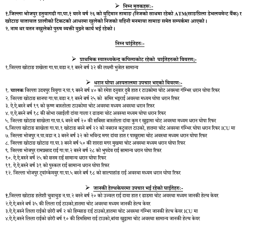 बाँकी घाइतेहरुको कपिलाकोट स्वास्थ्य चौकी, धरानको घोपा अस्पताल र जानकी हेल्थकेयरमा उपचार भइरहेको छ । घोपा अस्पतालमा १२ जना, जानकी हेल्थ केयरमा ४ जना र कपिलाकोट स्वास्थ्य चौकीमा १ जनाको उपचार भइरहेको छ ।