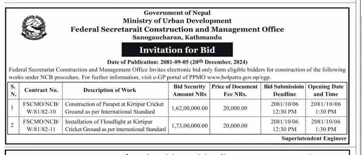 सहरी विकास मन्त्रालय अन्तर्गतको संघीय सचिवालय निर्वाण तथा व्यवस्थापन कार्यालयले अन्तर्राष्ट्रिय स्तरको प्यारापिट र फ्लडलाइटका लागि आज बोलपत्र आह्वान गरेको हो ।