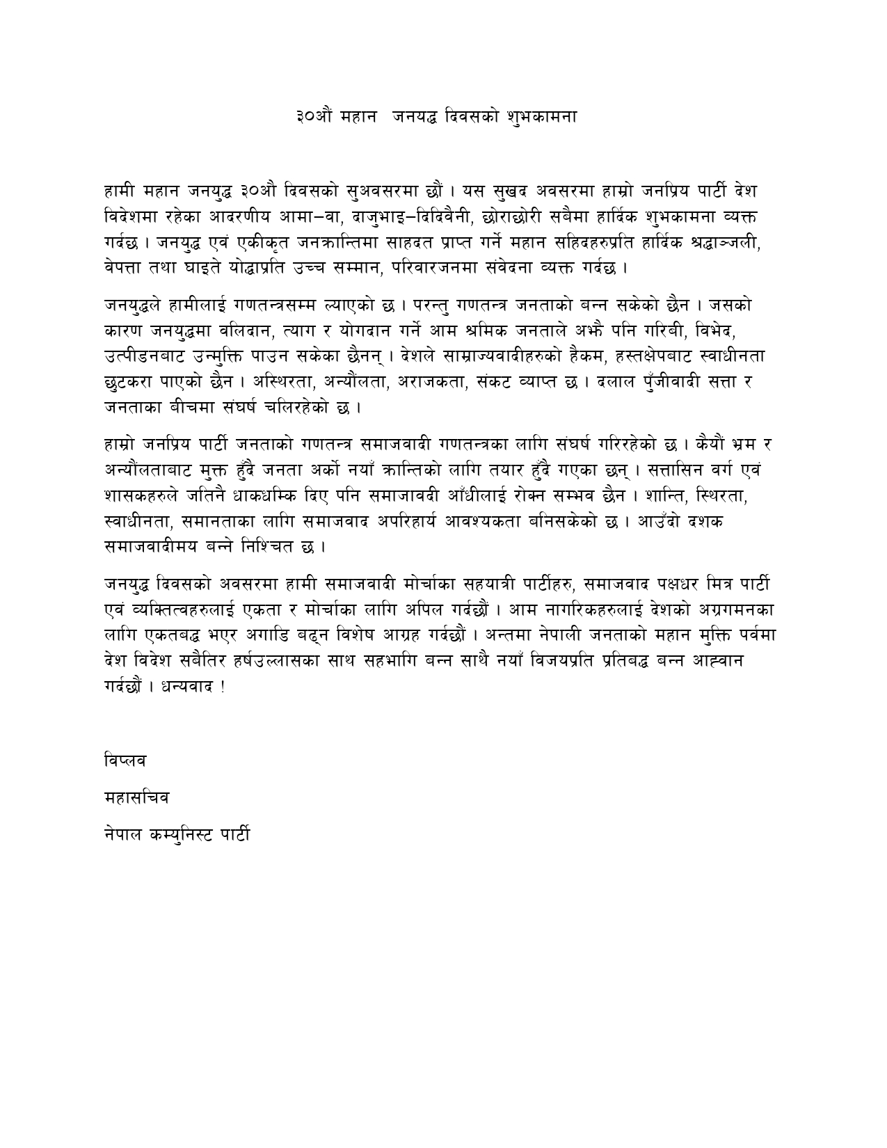 ३०औं महान जनयुद्ध दिवसको शुभकामना सहित
