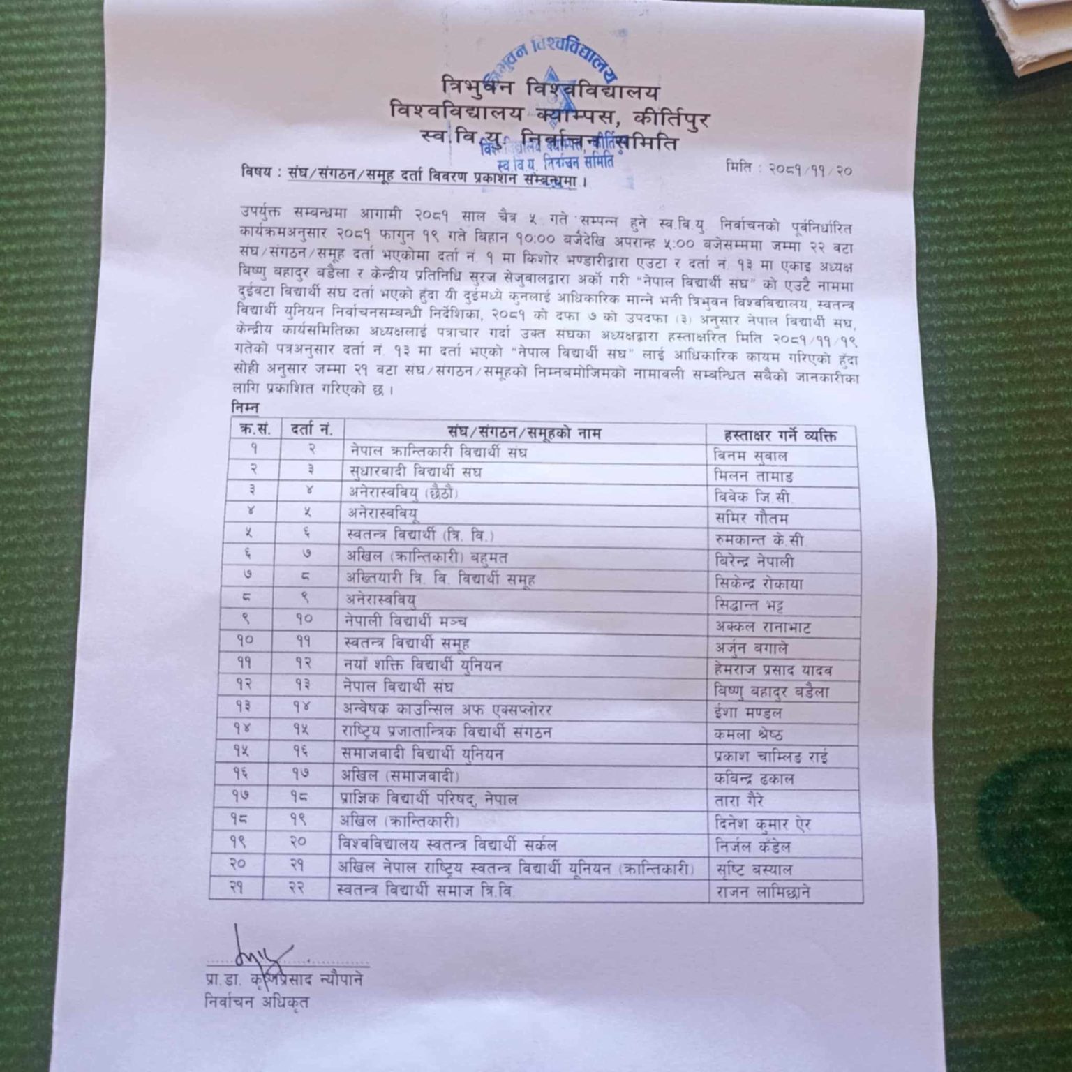 शीर्ष राजनीतिक दलका विद्यार्थी संगठनहरू नेपाल विद्यार्थी संघ, अनेरास्ववियू, अखिल क्रान्तिकारी, अखिल (क्रान्तिकारी) बहुमत लगायतका संगठनले आफ्नो नामावली दर्ता गराएको त्रिवि क्याम्पस प्रमुख अक्कलदेव मिश्रले जानकारी दिए ।