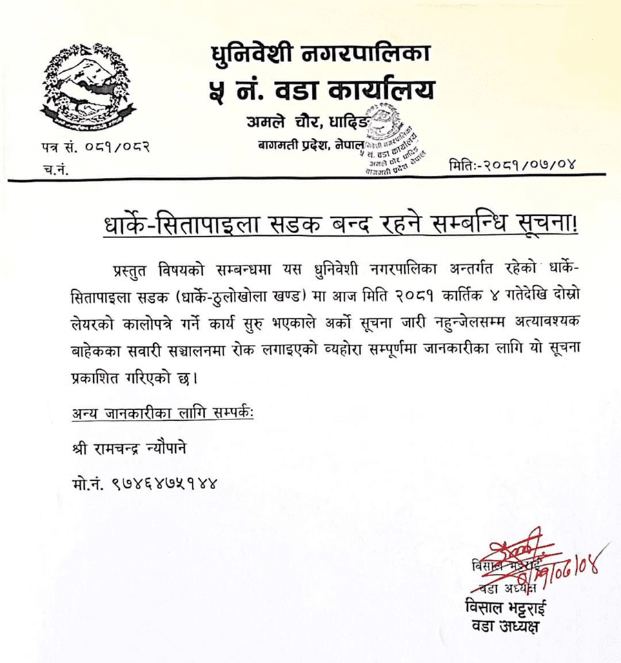 धुनेबेसी नगरपालिका वडा नम्बर ५ ले आइतबार एक सूचना प्रकाशित गर्दै यसबारे जानकारी गराएको हो ।