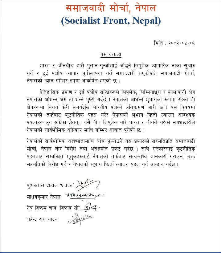 मोर्चाले शुक्रबार विज्ञप्ति जारी गर्दै मोर्चाले भारत र चीनबिच हालै पुलान– गुन्जीलाई जोड्ने लिपुलेक व्यापारिक नाका सुचारुका लागि दुई पक्षीय व्यापार पुनर्स्थापना गर्ने समझदारीप्रति गम्भीर ध्यानाकर्षण भएको भन्दै नेपाल सरकारसँग यस्तो माग गरेको हो ।