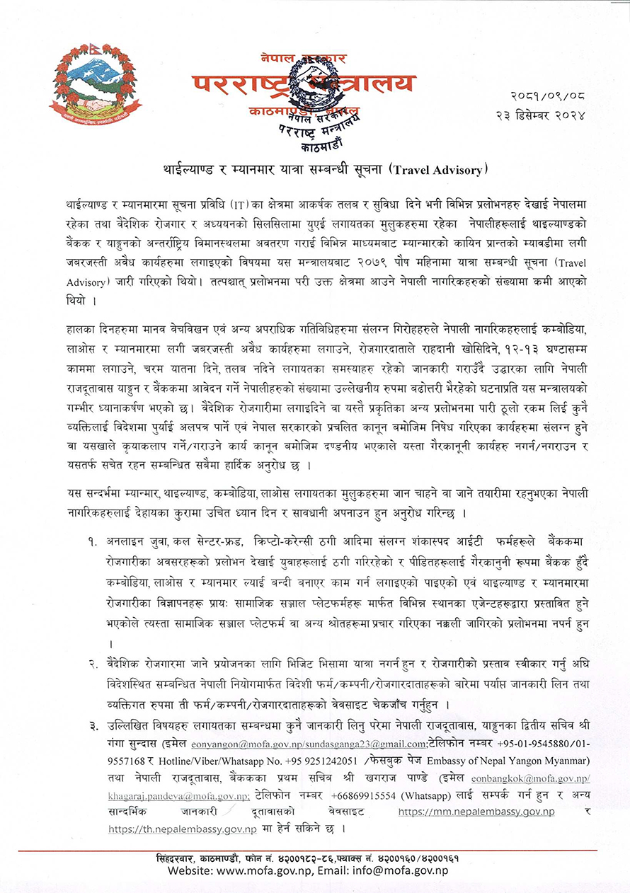थाइल्याण्ड र म्यानमारमा सूचना प्रविधि क्षेत्रमा आकर्षक तलब र सुविधा दिने प्रलोभनहरु देखाई नेपालमा रहेका तथा वैदेशिक रोजगार र अध्ययनको सिलसिलामा युएई लगायतका मुलुकहरुमा रहेका नेपालीहरूलाई थाइल्याण्डको बैंकक र याङ्गुनको अन्तर्राष्ट्रिय विमानस्थलमा अवतरण गराई विभिन्न माध्यमबाट म्यान्मारको कायिन प्रान्तको म्यावडी पुर्याएर जबरजस्ती अवैध काममा लगाएको विषय यसअघि पनि सार्वजनिक भएको थियो । त्यसपछि परराष्ट्र मन्त्रालयबाट २०७९ पुस महिनामा यात्रा सम्बन्धी सूचना (ट्राभल एडभाइजरी) जारी गरेपछि उक्त क्षेत्रमा पुग्ने नेपाली नागरिकहरुको संख्यामा कमी आएको थियो ।
