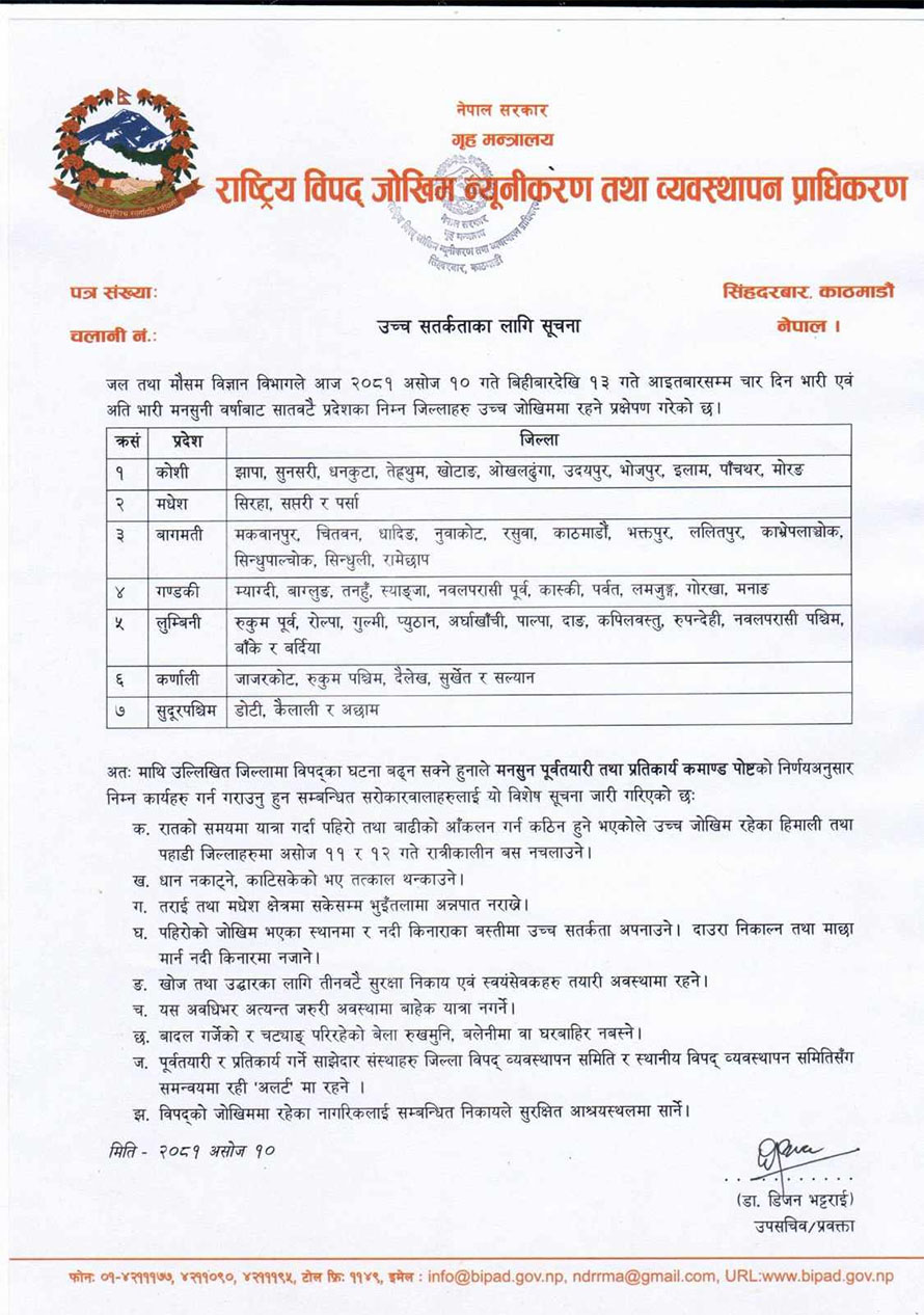 साथै धान नकाट्न र काटिसकेको भए तत्काल थन्काउन, तराई मधेश क्षेत्रसमा सकेसम्म भुइँतलामा अन्नपात नराख्न समेत प्राधिकरणले आग्रह गरेको छ ।