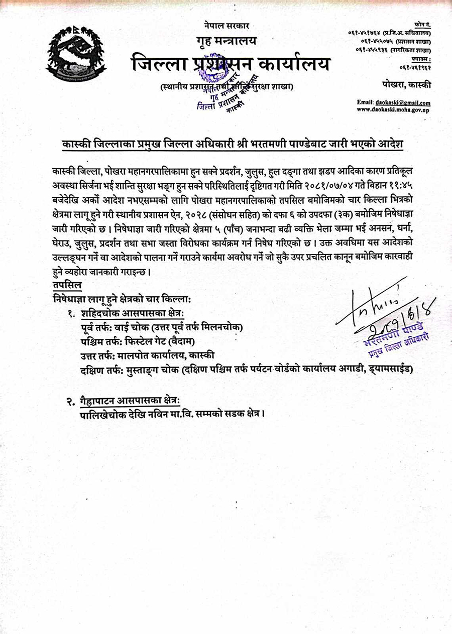 जिल्ला प्रहरी कार्यालय कास्कीले एक सूचनाच जारी गर्दै प्रदर्शन, जुलुस, हुलदंगा तथा झडप आदिका कारण प्रतिकुल अवस्था सिर्जना हुन सक्ने भएकाले निषेधाज्ञा जारी गरिएको जनाएको छ ।