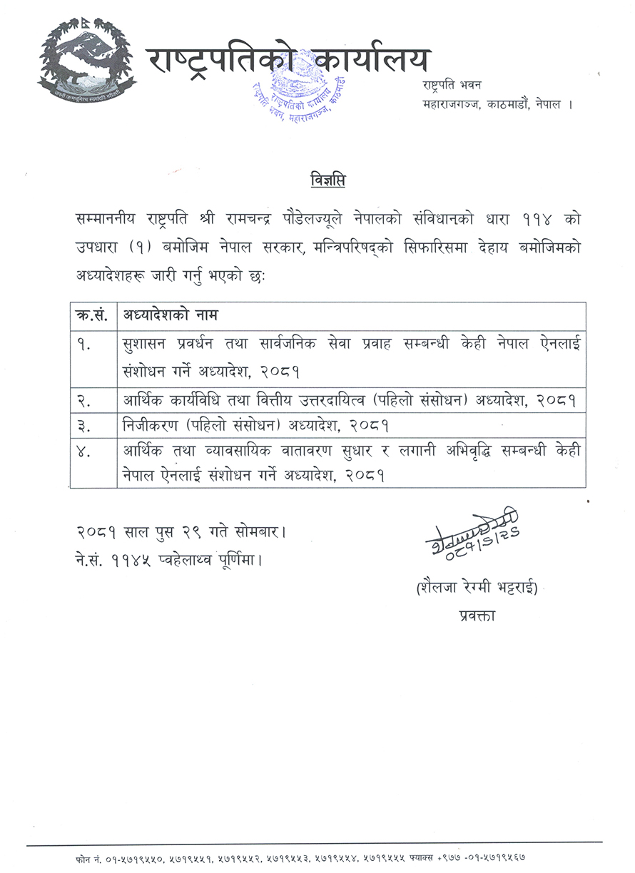सुशासन प्रवर्द्धन तथा सार्वजनिक सेवा प्रवाह सम्बन्धी केही नेपाल ऐनलाई संशोधन गर्ने अध्यादेश–२०८१, नेपाल कार्यविधि तथा वित्तिय उत्तरदायित्व पहिलो संशोधन अध्यादेश–२०८१, नीजिकरण पहिलो संशोधन अध्यादेश–२०८१, आर्थिक तथा व्यवसायिक वातावरण सुधार र लगानी अभिवृद्धिसम्बन्धी केही नेपाल ऐनलाई संशोधन गर्ने अध्यादेश–२०८१ जारी भएको राष्ट्रपति कार्यालयकी प्रवक्ता शैलेजा रेग्मी भट्टराईले जानकारी दिएकी छिन् ।